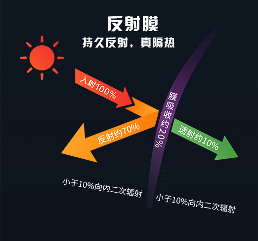 采用先進的磁控濺射工藝將金、銀、鈦、鎳、銦等貴金屬均勻濺射到PET基材上,就像一面鏡子,能夠反射大約70%的紅外熱量,持久隔熱,令您的車廂清爽愜意。
